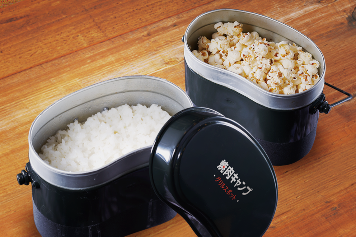 自分のテーブルで炊いて作る飯盒ごはんは、粒立ちが良くお米の甘味が際立って、スパイシーなキャンプのお肉とよく合います。また飯盒を使ったポップコーンはポンポンという音と一緒に香りとコーンが弾けます。